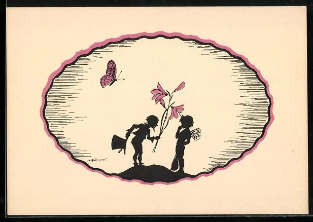 Künstler-AK Elsbeth Forck: Silhouette von einem Kobold, der einer Fee eine Blume überreicht