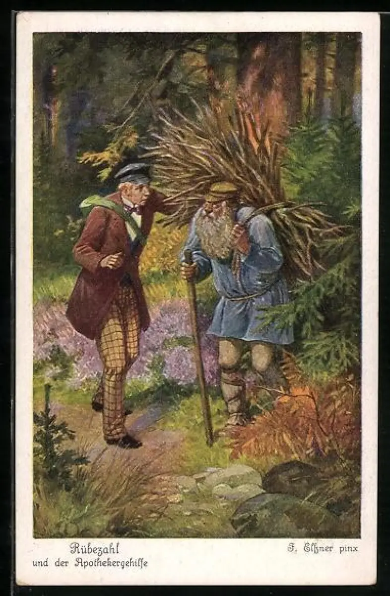 Künstler-AK Elssner: Rübezahl und der Apothergehilfe mit Feuerholz auf dem Rücken