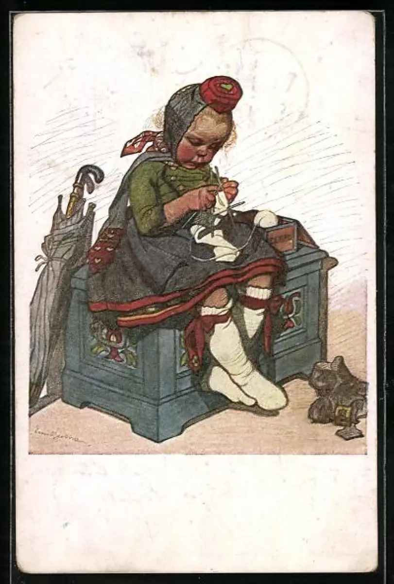 Künstler-AK Emil Beithan: Kleines Mädchen in Tracht strickt Strümpfe
