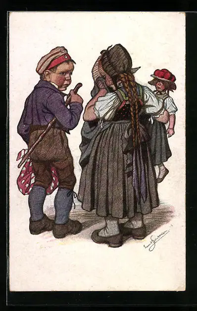Künstler-AK Emil Beithan: Mädchen in Tracht weint zum Abschied von einem Jungen als Soldat