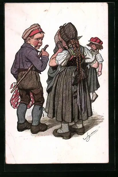 Künstler-AK Emil Beithan: Mädchen mit Puppe weint beim Abschied