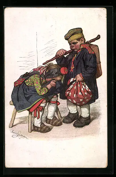 Künstler-AK Emil Beithan: Mädchen weint beim Abschied von ihrem geliebten Soldaten, hessische Tracht