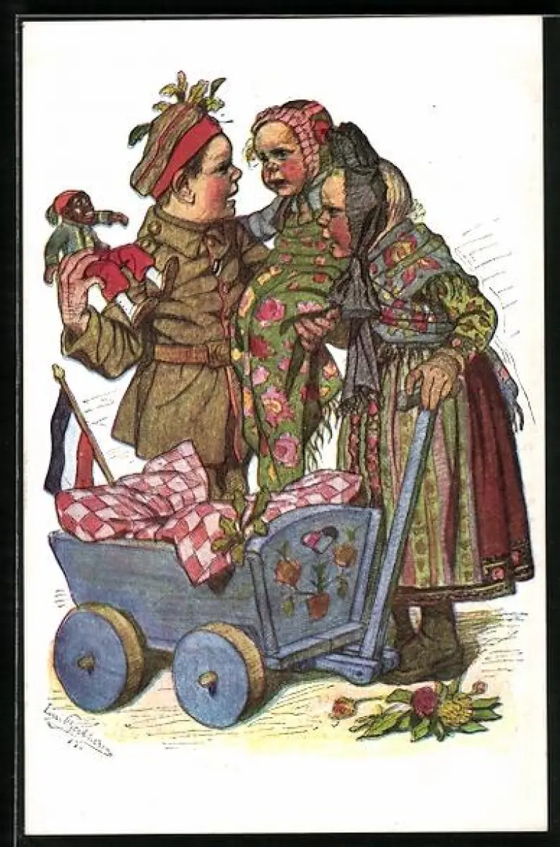 Künstler-AK Emil Beithan: ein Soldat in Uniform hat für sein Kind eine Negerpuppe mitgebracht