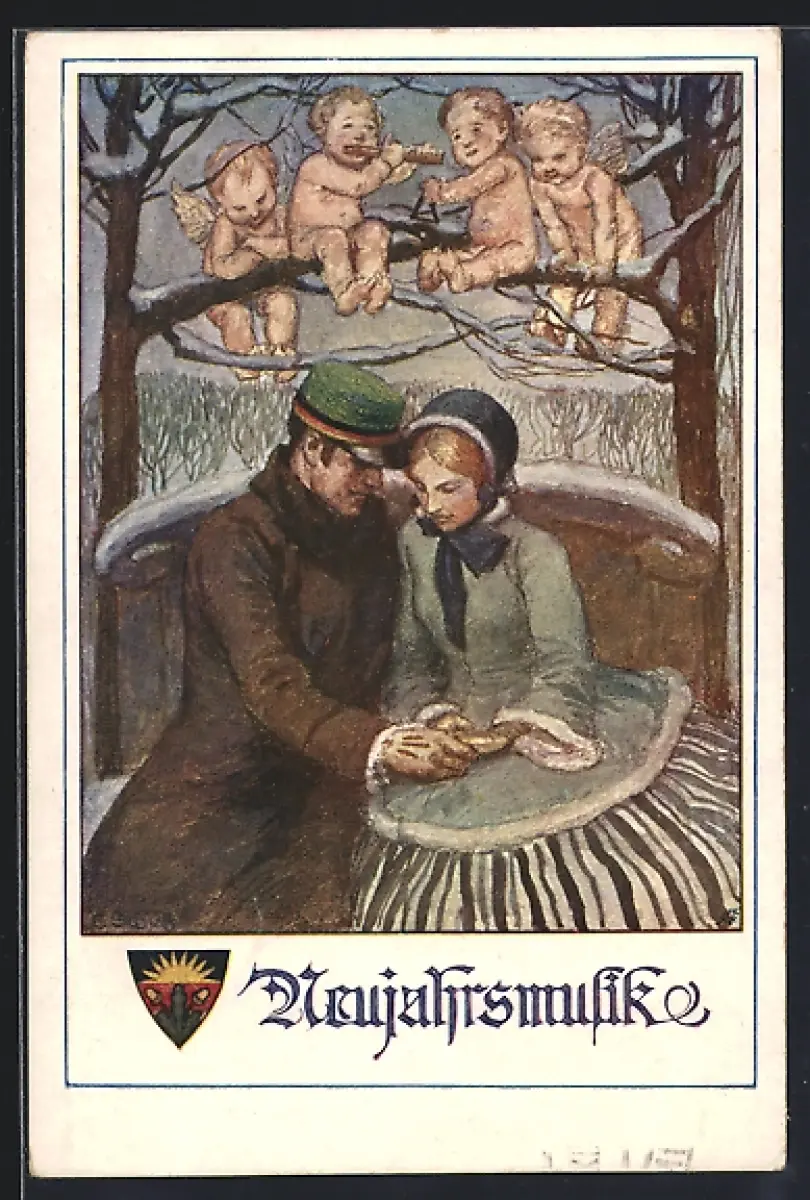 Künstler-AK Engel über einem Studenten und seiner Geliebten