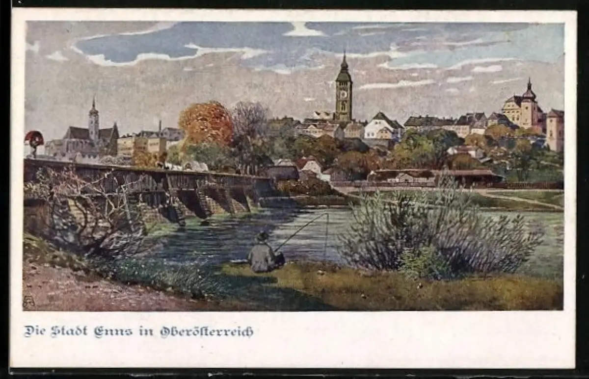 Künstler-AK Enns, Ortsansicht mit Brücke