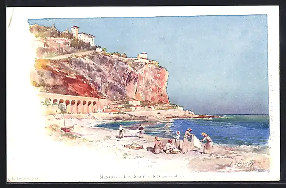 Künstler-AK Ernest Lessieux: Menton, Les Rochers Rouges
