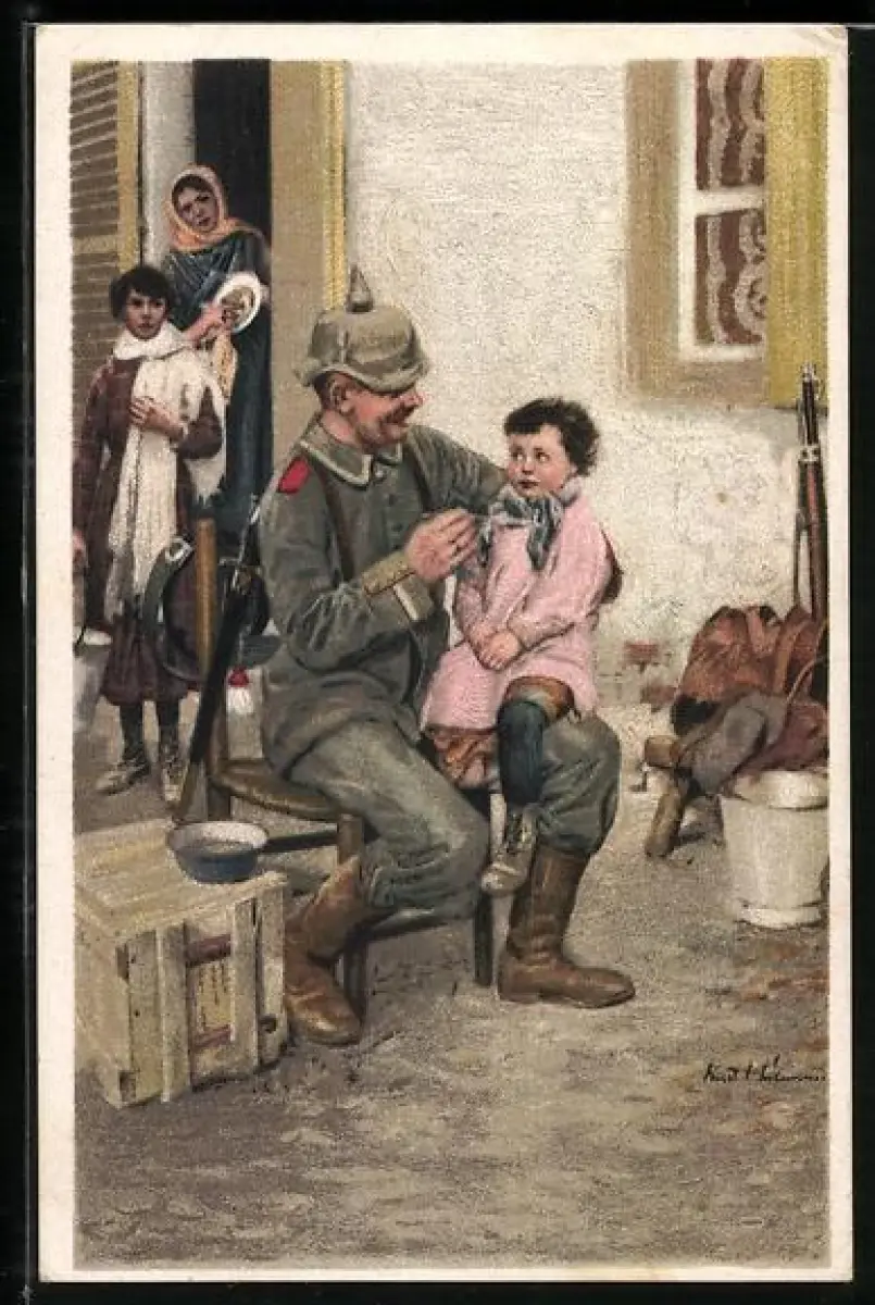 Künstler-AK Ernst Heilemann: Deutscher Soldat teilt seine Suppe mit feindlichem Kind, Propaganda