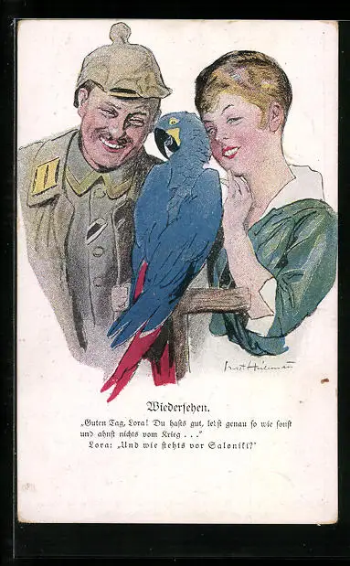 Künstler-AK Ernst Heilemann: Wiedersehen, Soldat kehrt zur Frau zurück, Papagei