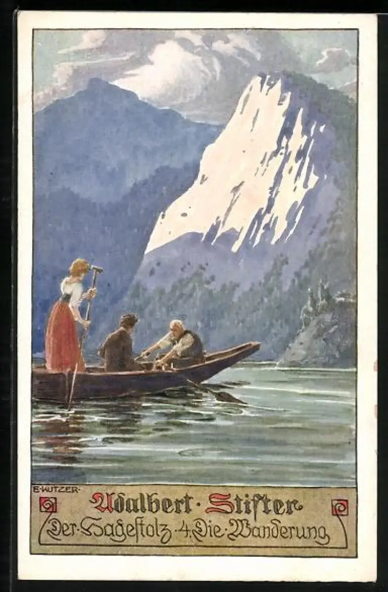 Künstler-AK Ernst Kutzer: Adalbert Stifter, Der Sagestolz, 4. Die Wanderung, Personen auf Ruderboot im See in den Bergen
