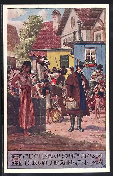 Künstler-AK Ernst Kutzer: Adalbert Stifter, Der Waldbrunnen, turbulentes Treiben im Ort