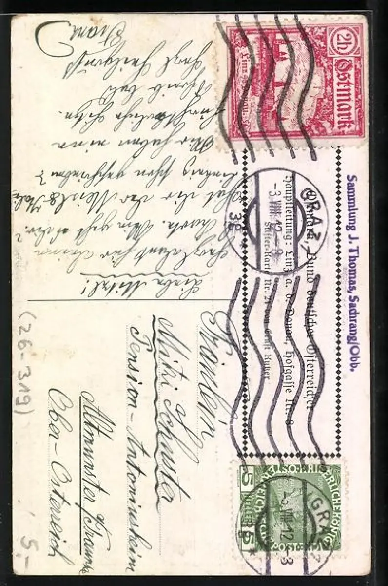 alte Ansichtskarte, gelaufen 1912, Eckknick li. oben, Stempelspur, Bugspur li. oben, guter Zustand