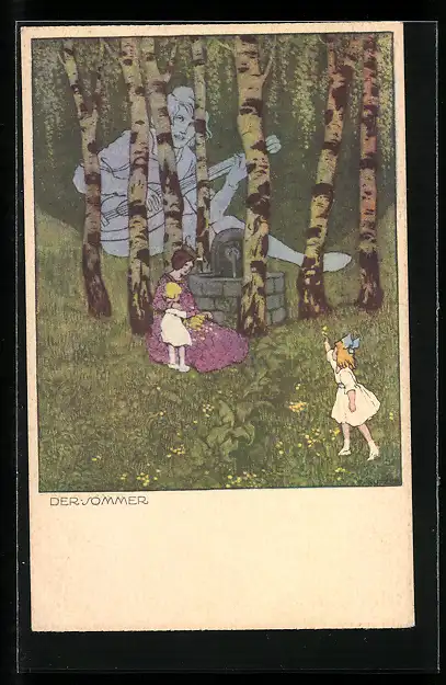 Künstler-AK Ernst Kutzer: Mutter mit Kindern am Brunnen im Wald, Mann mit Laute