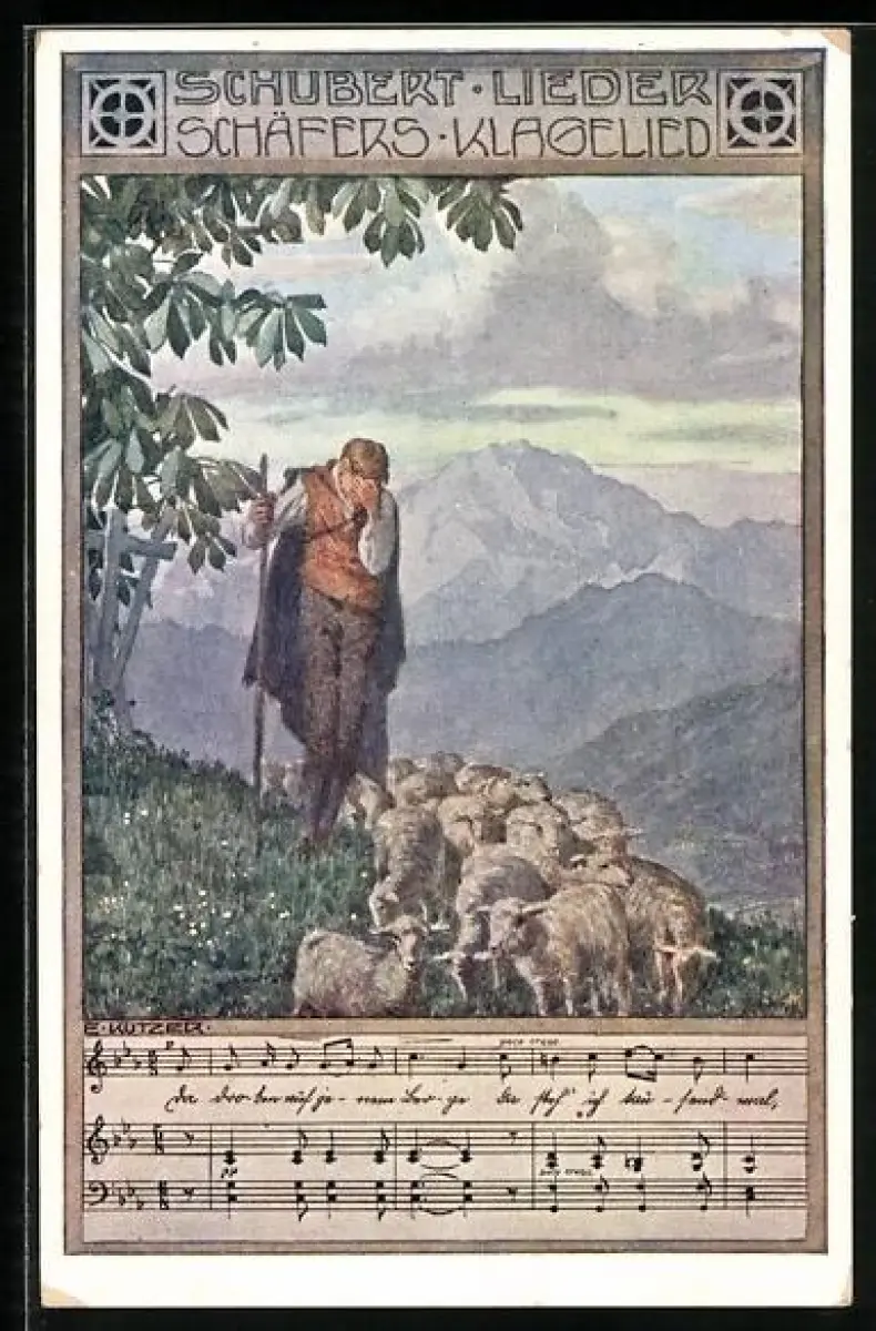 Künstler-AK Ernst Kutzer: Schubert-Lieder Schäfers Klagelied, weinender Schäfer bei seiner Herde