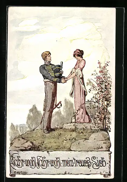 Künstler-AK Ernst Kutzer: Soldat in Uniform der Befreiungskriege verabschiedet sich von seiner Geliebten