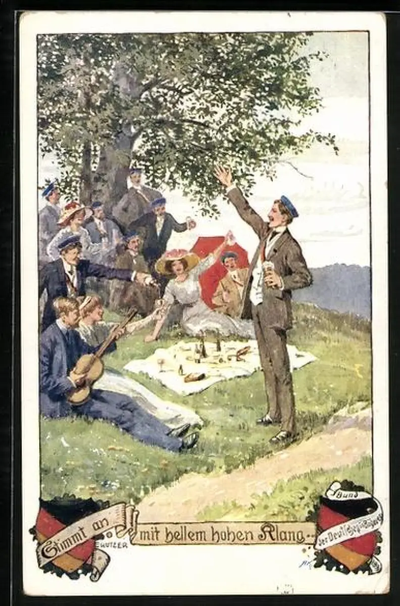 Künstler-AK Ernst Kutzer: Stimmt an mit hellem hohen Klang, Studenten bei Picknick im Grünen