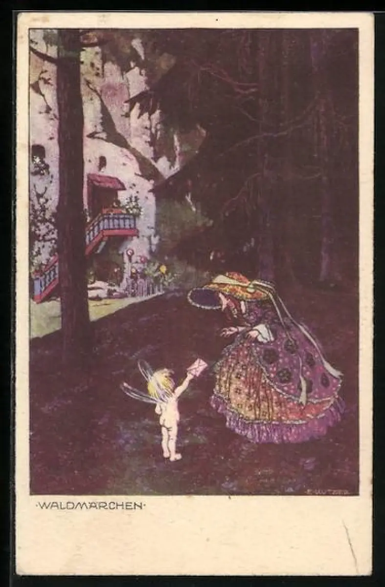 Künstler-AK Ernst Kutzer: Waldmärchen, Kleine Fee überreicht Frau im Kleid einen Brief