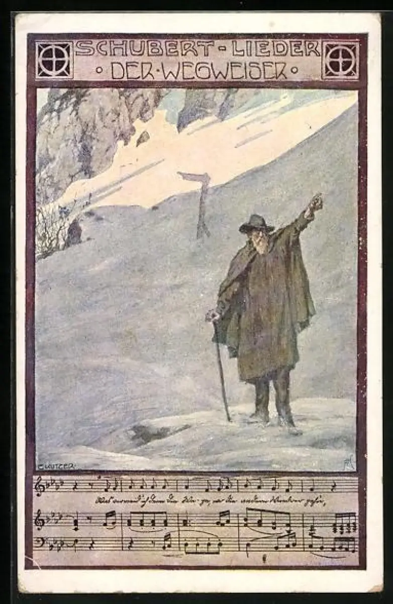 Künstler-AK Ernst Kutzer: der Wegweiser, alter Mann im Schnee