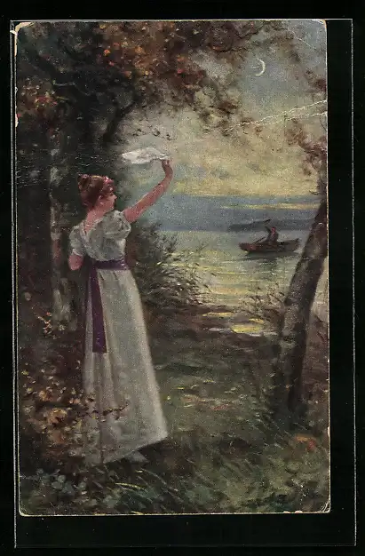 Künstler-AK Ernst Schlemo: Frau winkt einem Ruderer zum Abschied