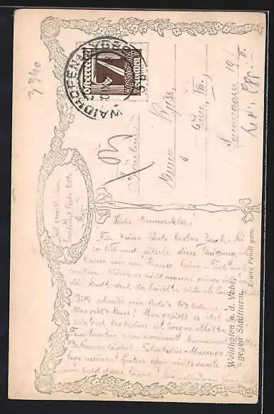 Personenbezogene Daten auf der Rückseite der Karte wurden durch blauen Textmarker unkenntlich gemacht. Die blauen Stellen sind auf die Vorderseite durchgeweicht und wirken sich negativ auf das Postkartenfoto aus