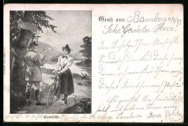 Künstler-AK Erwischt, Radlerin vom Jäger an das Verbotsschild erinnert