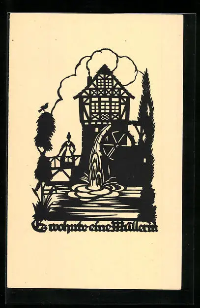 Künstler-AK Es wohnte eine Müllerin, Motiv einer Wassermühle, Scherenschnitt