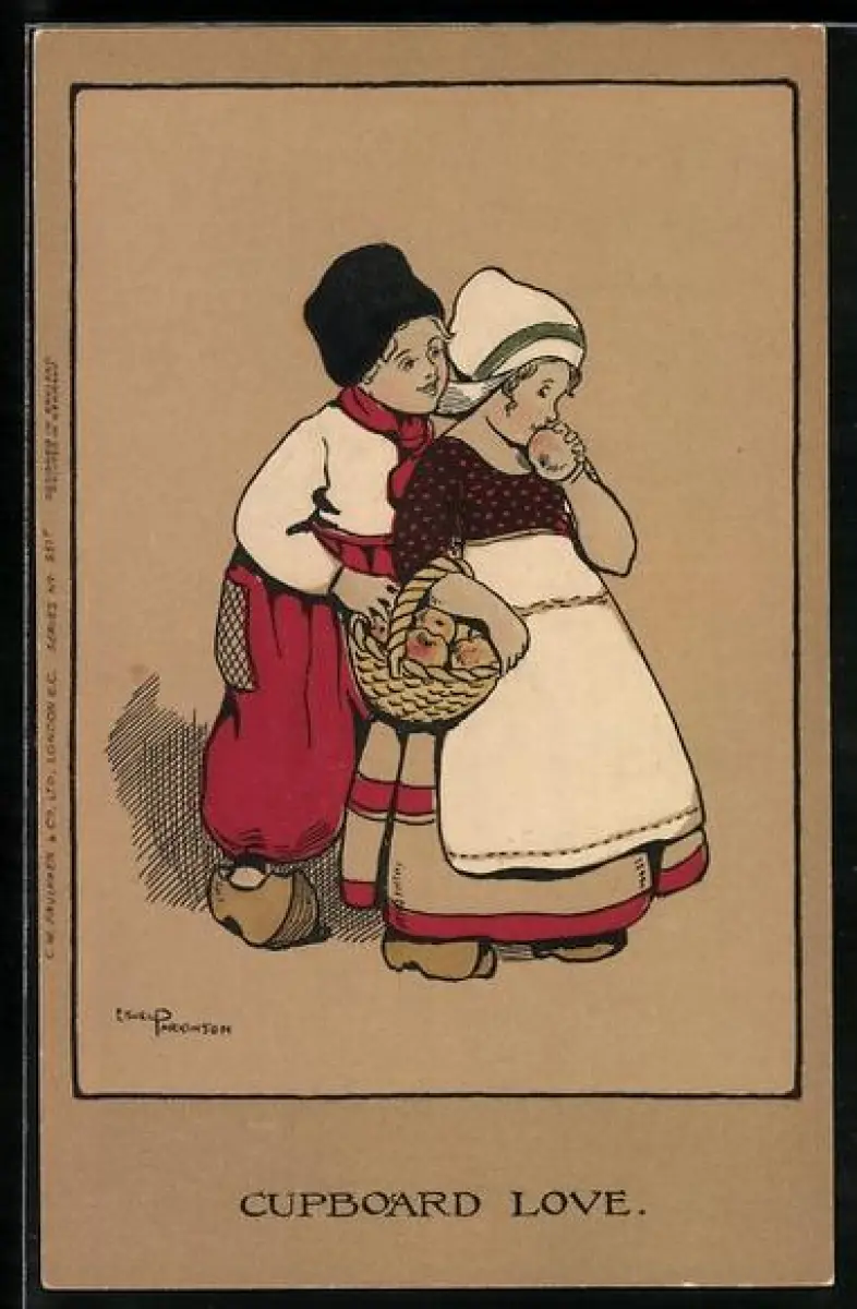 Künstler-AK Ethel Parkinson: Cupboard Love, Holländisches Paar mit Apfelkorb