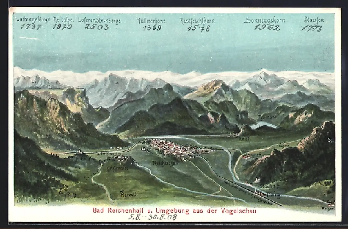 Künstler-AK Eugen Felle: Bad Reichenhall, Ortsansicht mit Umgebung aus der Vogelschau