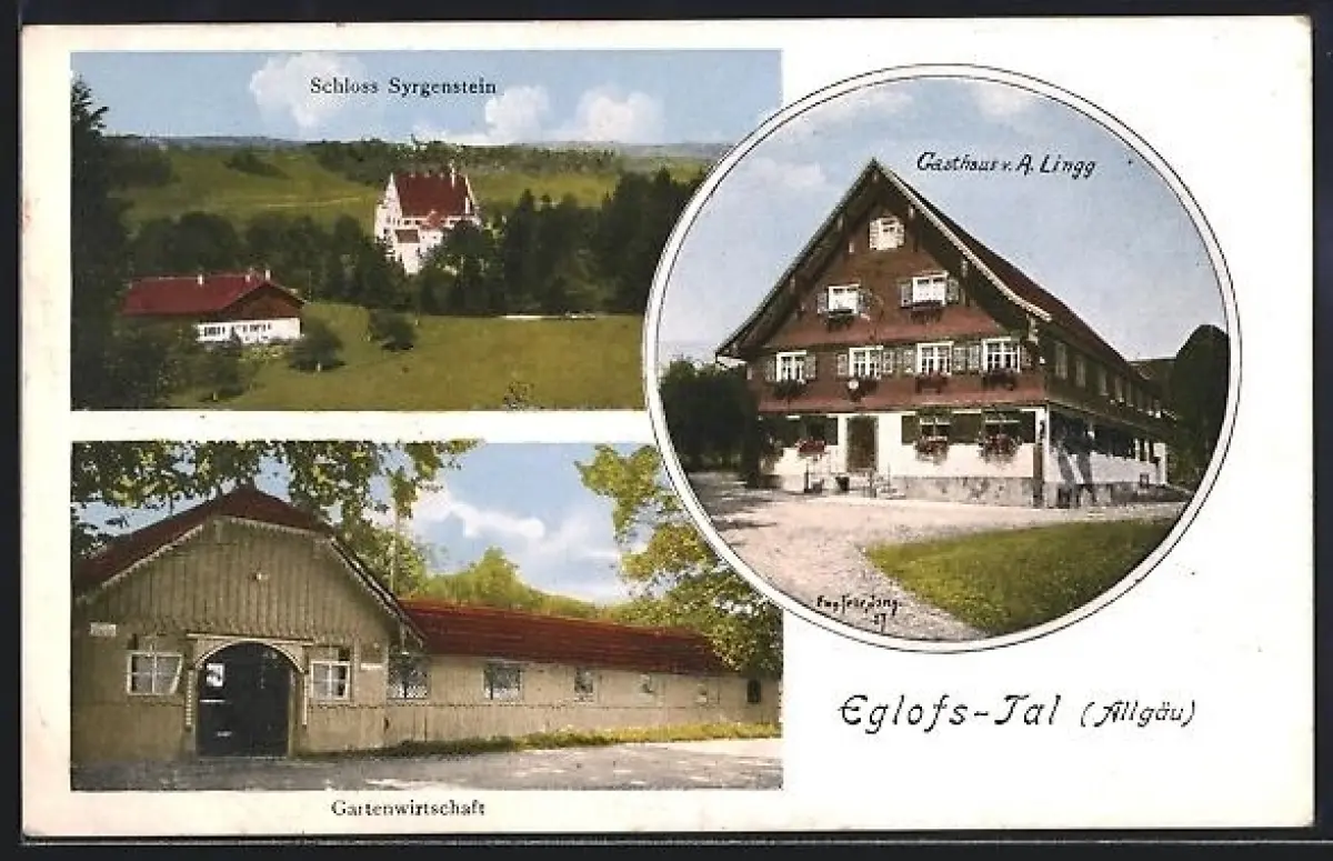 Künstler-AK Eugen Felle: Eglofs-Tal /Allgäu, Gasthaus A. Lingg, Schloss Syrgenstein