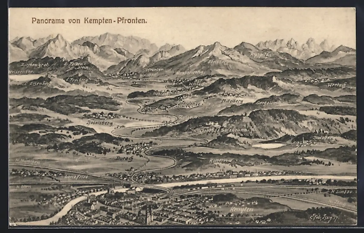 Künstler-AK Eugen Felle: Kempten / Allgäu, Panorama ins Tal