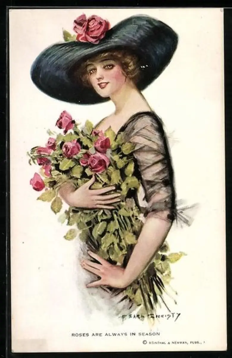 Künstler-AK F. Earl Christy: Roses are always in Season, Dame mit Rosen