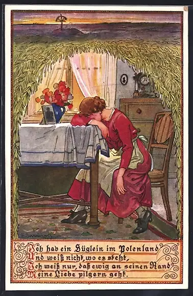 Künstler-AK F. Gareis: Traurige Frau sitzt an einem Tisch mit dem Foto eines Soldaten