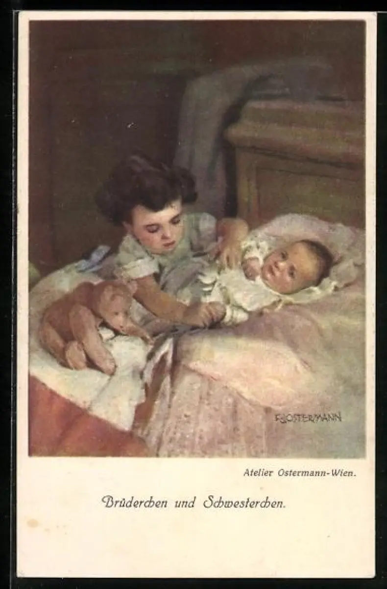 Künstler-AK F. J. Ostermann: Mädchen kümmert sich ums kleine Geschwisterchen