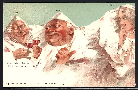 Künstler-AK F. Killinger Nr.114: Vermenschlichter Eiger, Möch und Jungfrau mit Weingläsern, Berggesichter