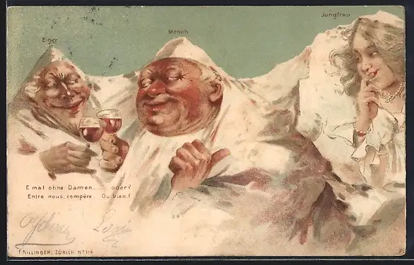 Künstler-AK F. Killinger Nr.114: Vermenschlichter Eiger, Möch und Jungfrau mit Weingläsern, Berggesichter