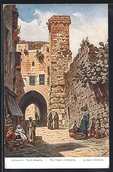 Künstler-AK F.Perlberg: Jerusalem, Turm Antonia, arabische Strassenszene