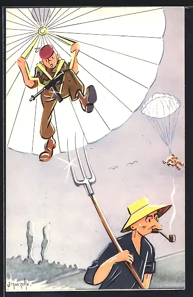 Künstler-AK Fallschirmspringer mit MPI erblickt ungläubig einen Bauer mit scharfer nach oben gehaltener Heugabel