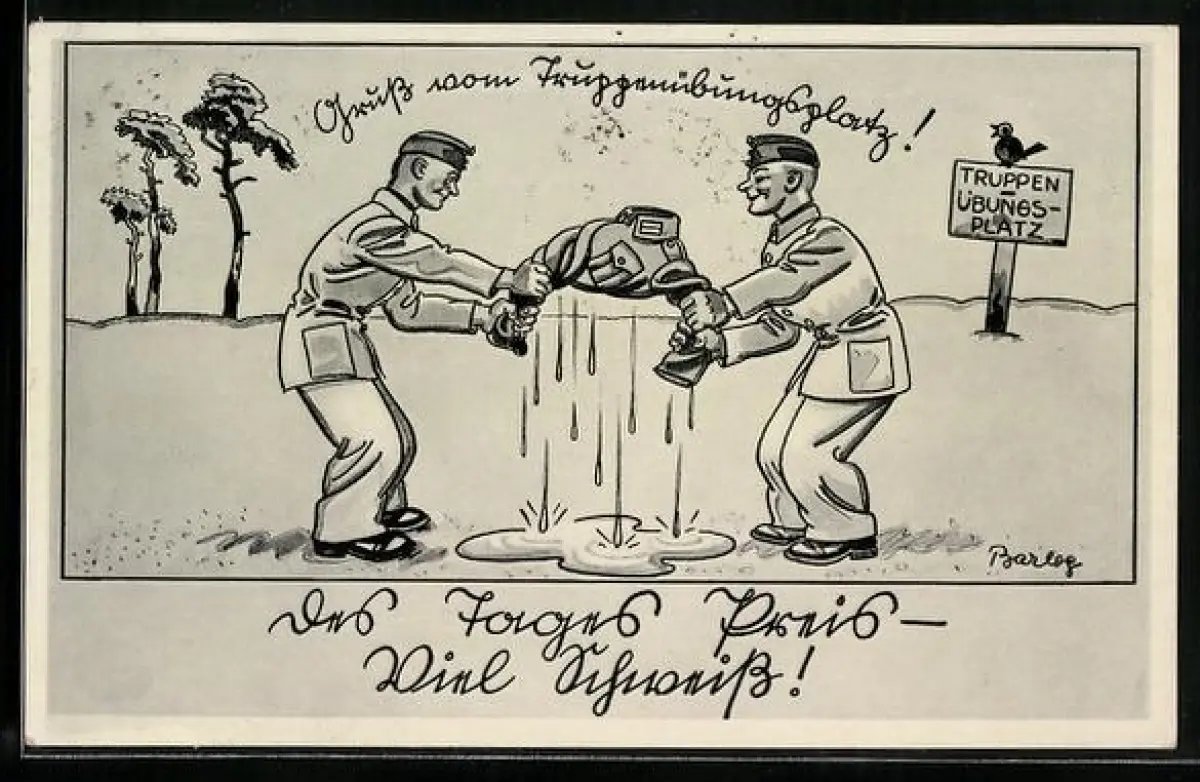 Künstler-AK Ferdinand Barlog: Gruss vom Truppenübungsplatz!, Soldatenhumor
