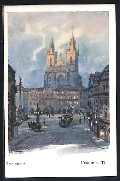 Künstler-AK Ferdinand Engelmüller: Prag, Tein-Kirche und Strassenbahn