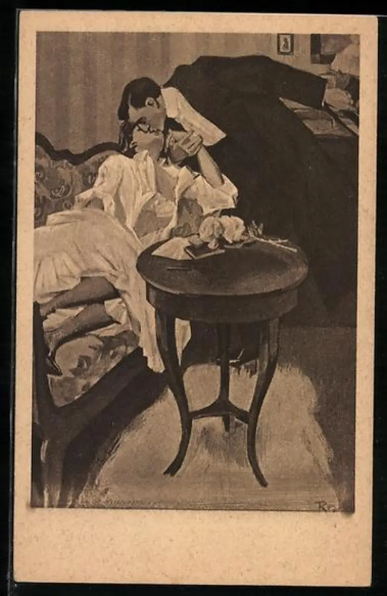 Künstler-AK Ferdinand von Reznicek: elegant gekleideter Herr küsst seine auf dem Sofa liegende Frau