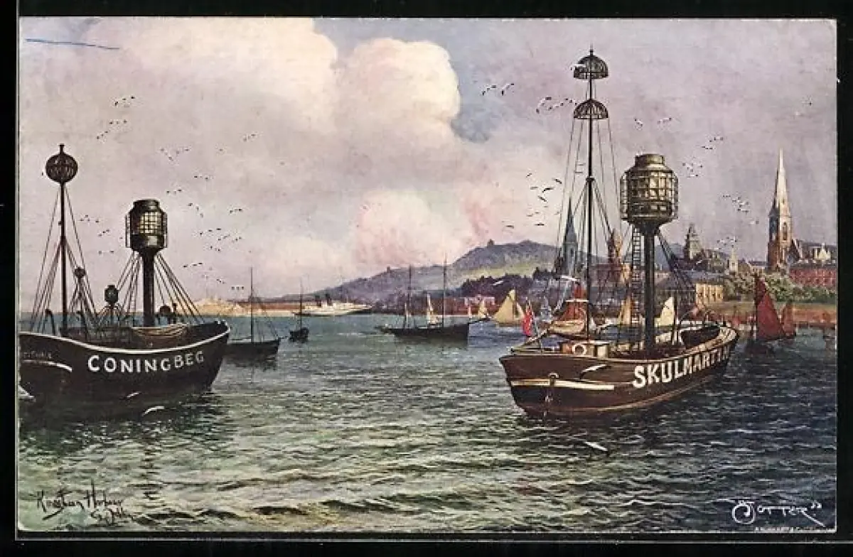 Künstler-AK Feuerschiffe Coningbeg und Skulmartin vor der Küste