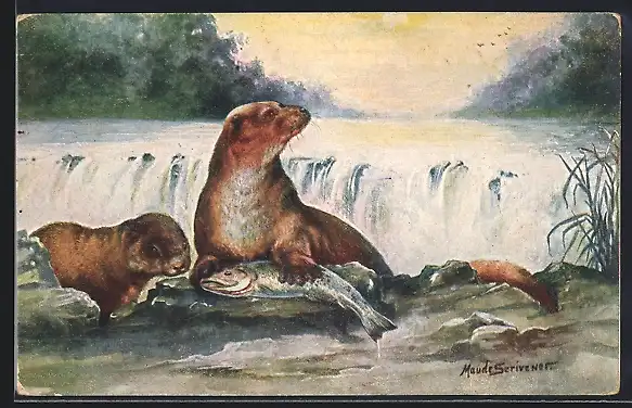 Künstler-AK Fischotter mit Beute vor einem Wasserfall