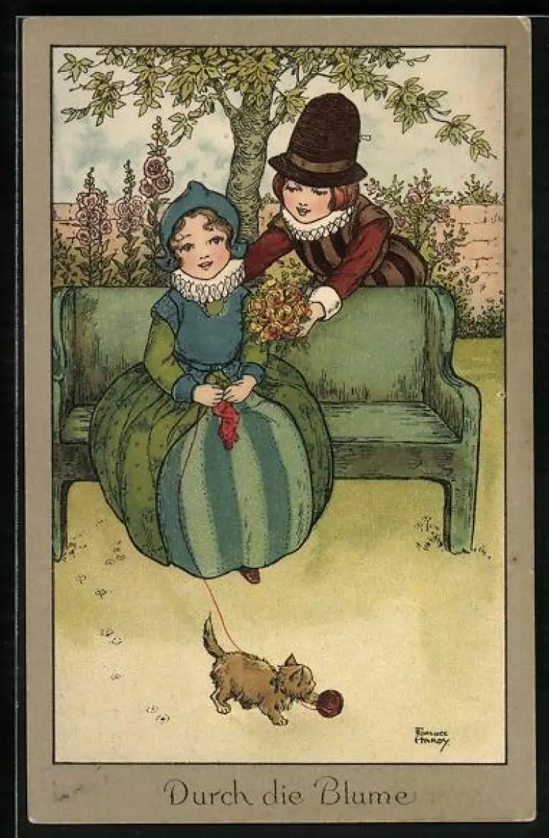 Künstler-AK Florence Hardy: Durch die Blume-Junge übergibt seiner Geliebten einen Blumenstrauss