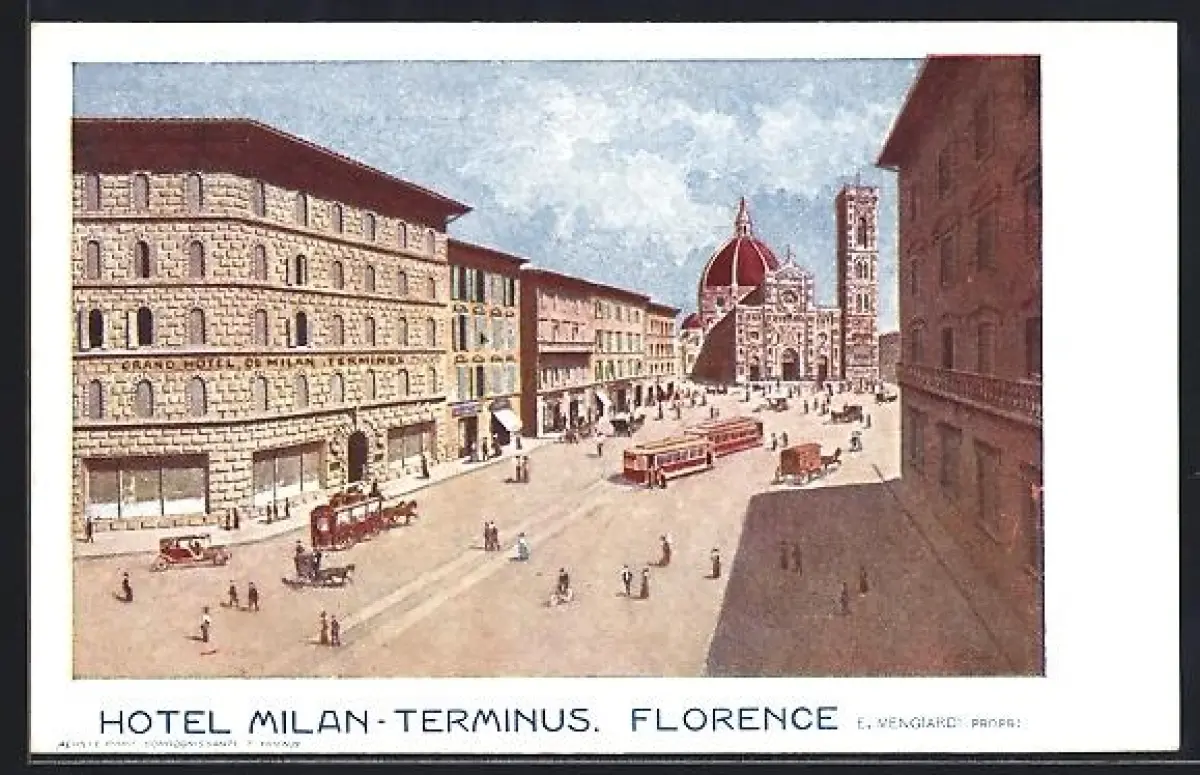 Künstler-AK Florenz, Grand Hotel de Milan Terminus mit Kirche und Turmgebäude