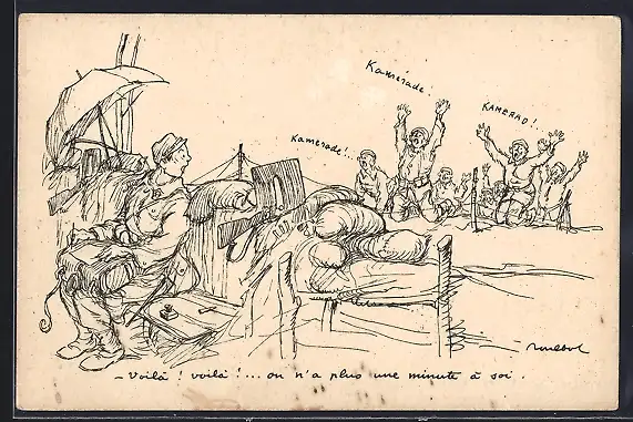 Künstler-AK Francisque Poulbot: Soldaten rufen nach ihrem Kameraden, der gerade schreibt