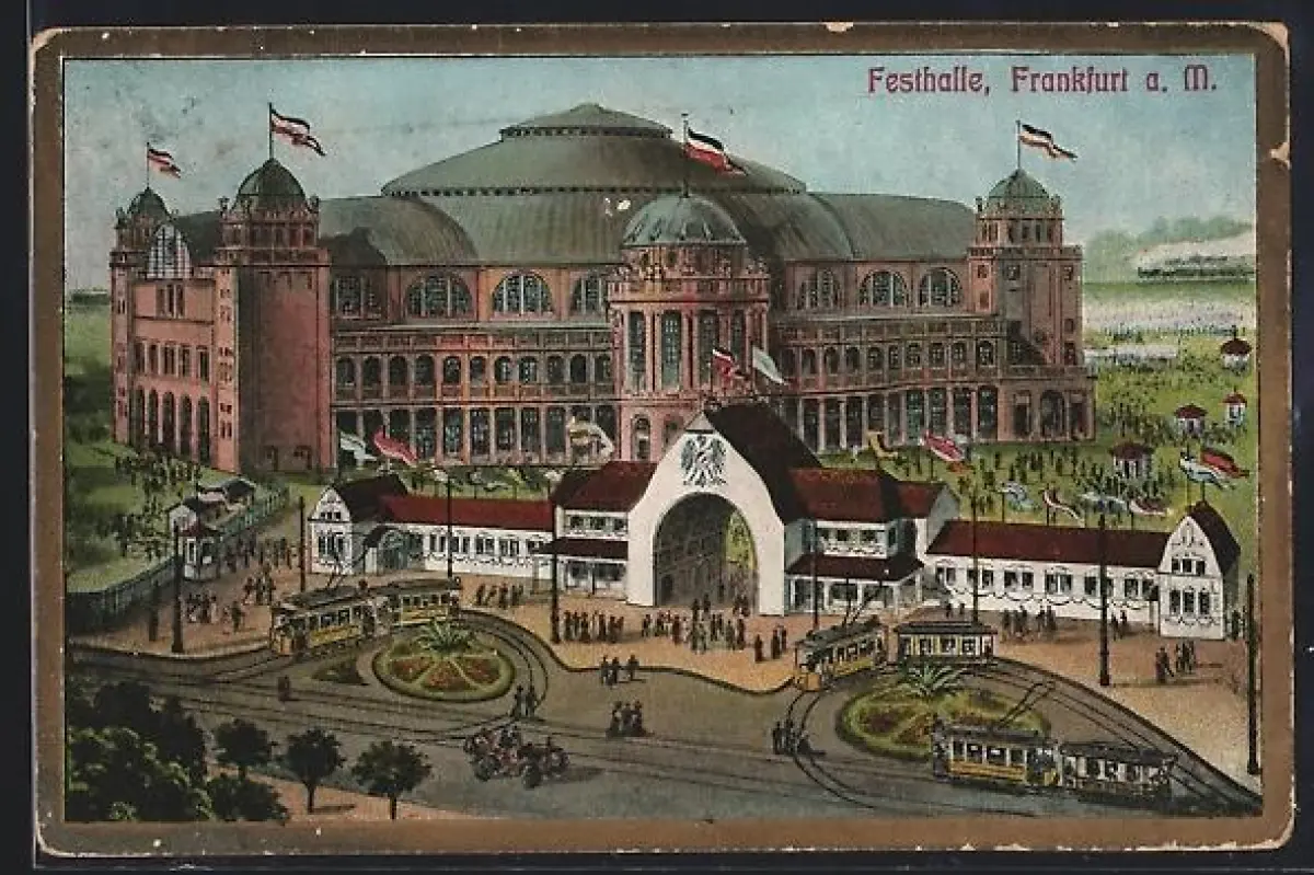 Künstler-AK Frankfurt-Westend, Festhalle mit Strassenbahnen aus der Vogelschau