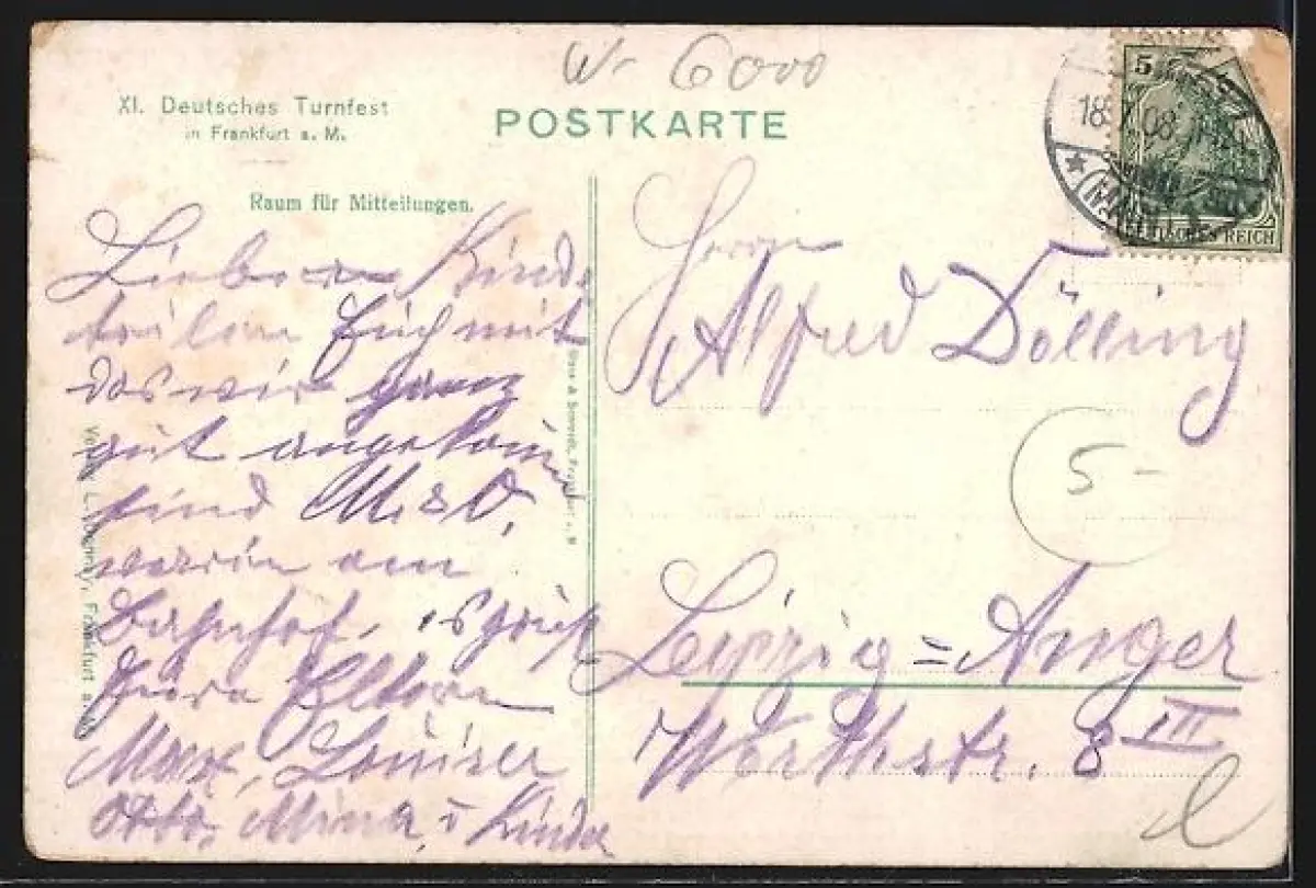 gelaufen 1908, Briefmarke entfernt, rückseitig Oberflächenschaden, minimaler Einriss re. oben, guter Zustand