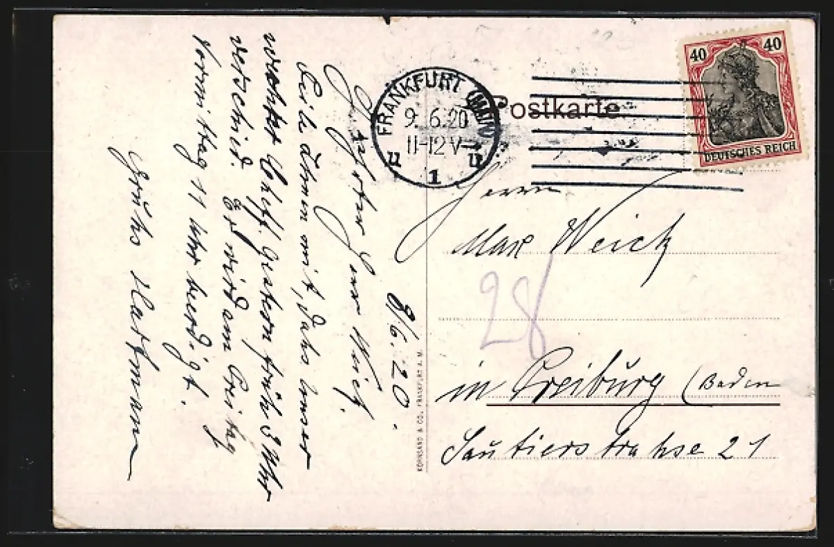 alte Ansichtskarte, gelaufen 1920, Stempelspur, Kantenschaden oben mittig