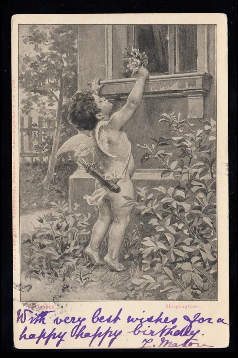 Künstler-AK Franz Doubek: Morgengruss - Amor am Fenster, MAILAND 22.11.1909