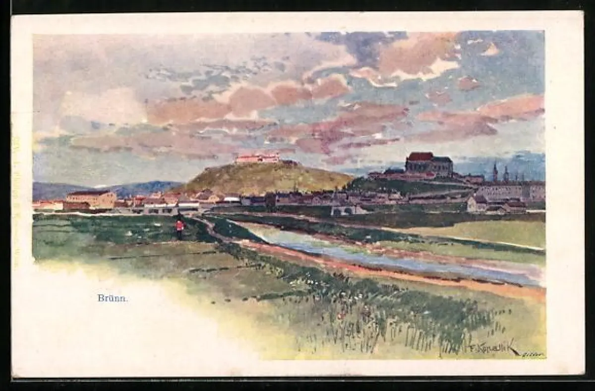 Künstler-AK Franz Kopallik: Brünn, Landschaftspanorama im Abendlicht