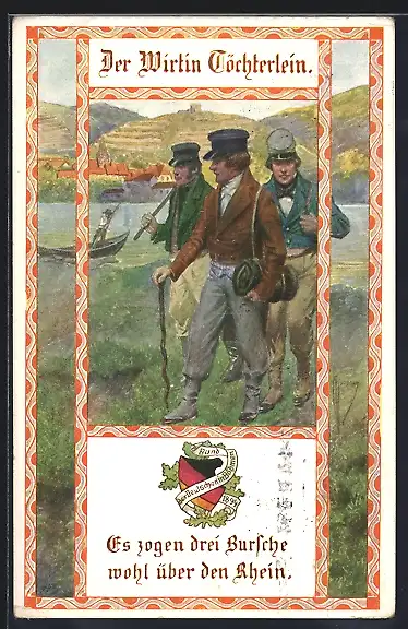 Künstler-AK Franz Kuderna: Der Wirtin Töchterlein, Es zogen drei Burschen wohl über den Rhein